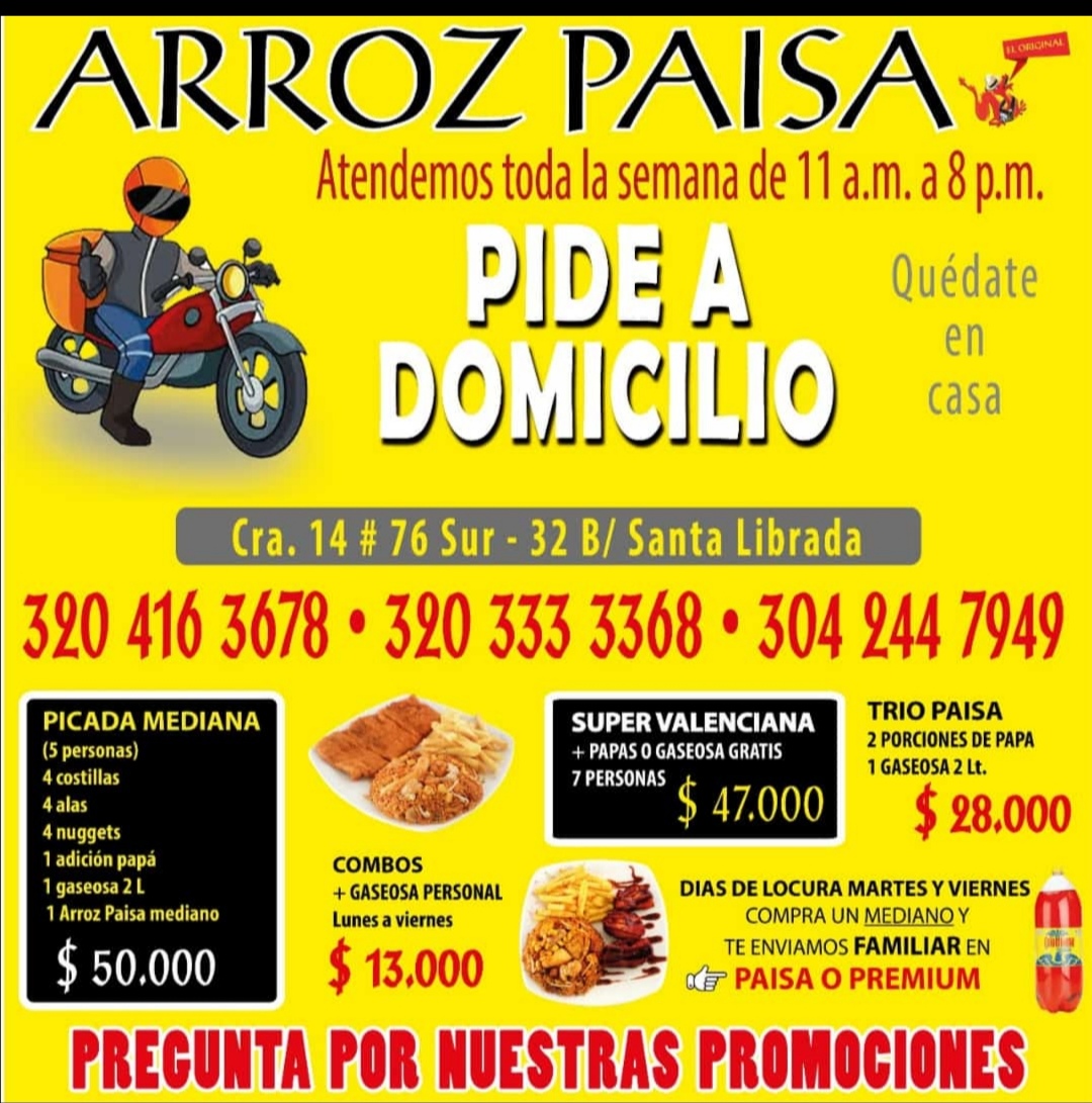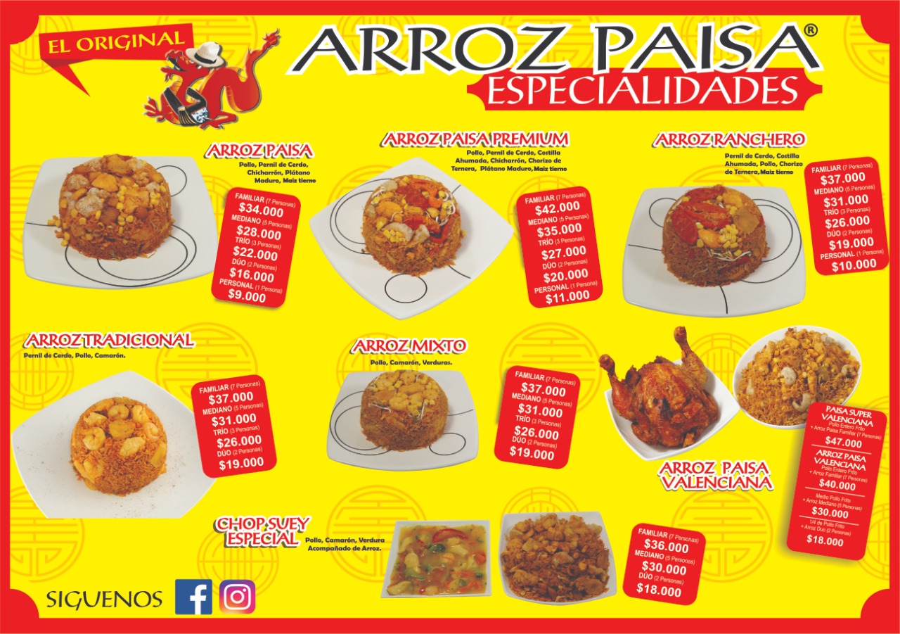 Somos una cadena de restaurantes que te ofrece arroz paisa el original, con los mejores estándares de calidad y sabor, directo hasta la puerta de tu casa usando todos los protocolos de Bio-seguridad para proteger a nuestros clientes.