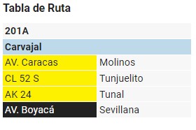 Las estaciones donde realiza paradas la ruta del SITP 201A cuando va hacia el Carvajal son las siguientes: