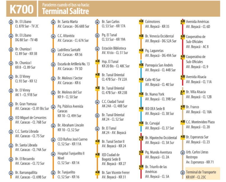 Las estaciones donde realiza paradas la ruta de SITP K700 cuando va hacia Terminal Salitre son las siguientes: